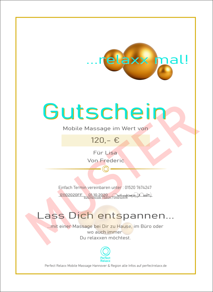 Relaxx… Verschenke die beste Zeit mit einem Geschenkgutschein für eine mobile Massage am Ort der Wahl.